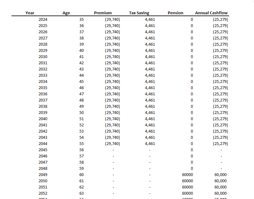 สมมติว่า เราเป็น หญิงไทยใจงาม อายุ อานาม 35 ปี สนใจซื้อประกันบำนาญในปีนี้ ซึ่งเป็นปี 2024 โดยแผนประกันบำนาญที่เราสนใจนั้น เราต้องจ่ายเบี้ยปีละ 29,740 บาท ไปจนอายุ 55 ปี และเริ่มได้รับเงินบำนาญตอนอายุ 60 ปีจนถึงอายุ 99 ปี โดยเราจะได้รับเงินบำนาญปีละ 60,000 บาท และเราจะได้ผลประโยชน์จากการลดหย่อนภาษี ตามฐานภาษีของเรา ในที่นี้เราใส่เป็น 15%