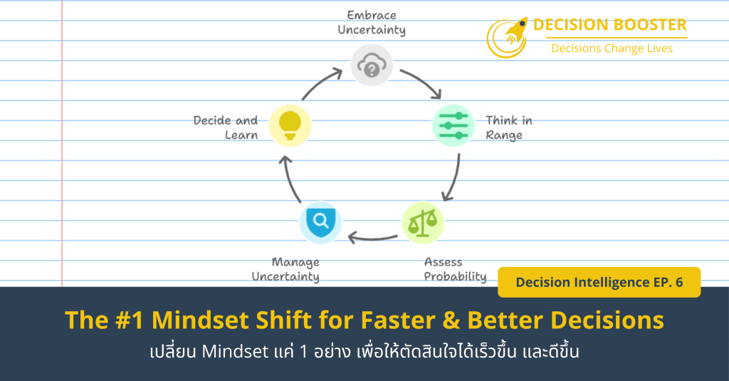 - พิจารณาผลลัพธ์ที่เป็นไปได้ทั้งหมด (Thinking in range) – แทนที่จะมองแค่ผลลัพธ์อย่างเดียว ให้มองภาพรวมว่า มีอะไรบ้างที่เป็นไปได้