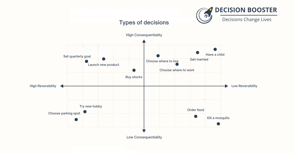 แต่ก่อนที่เราจะคุยกันถึงหลักการ 3 ข้อนั้น เรามาแบ่ง เรื่องที่เราต้องตัดสินใจ ออกเป็นประเภท ตาม ขนาดของผลกระทบ (consequentiality) และ ความยากง่ายในการเปลี่ยนใจ (reversibility)